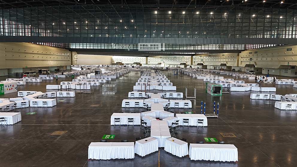 鐵馬護欄與隔離帶是分區“隱形向導”。展廳入口處,鐵馬護欄圍出“S”形簽到通道,配合紅色隔離帶,自然引導參賽者和觀眾分流。通道寬度嚴格控制在1.5米,既不會讓人感到局促,又能確保人流有序。折疊椅和長條桌的組合滿足了多樣需求。洛陽桌椅鐵馬租賃的師傅們擺椅子時特別用心,桌椅按照特定的路線進行擺放。