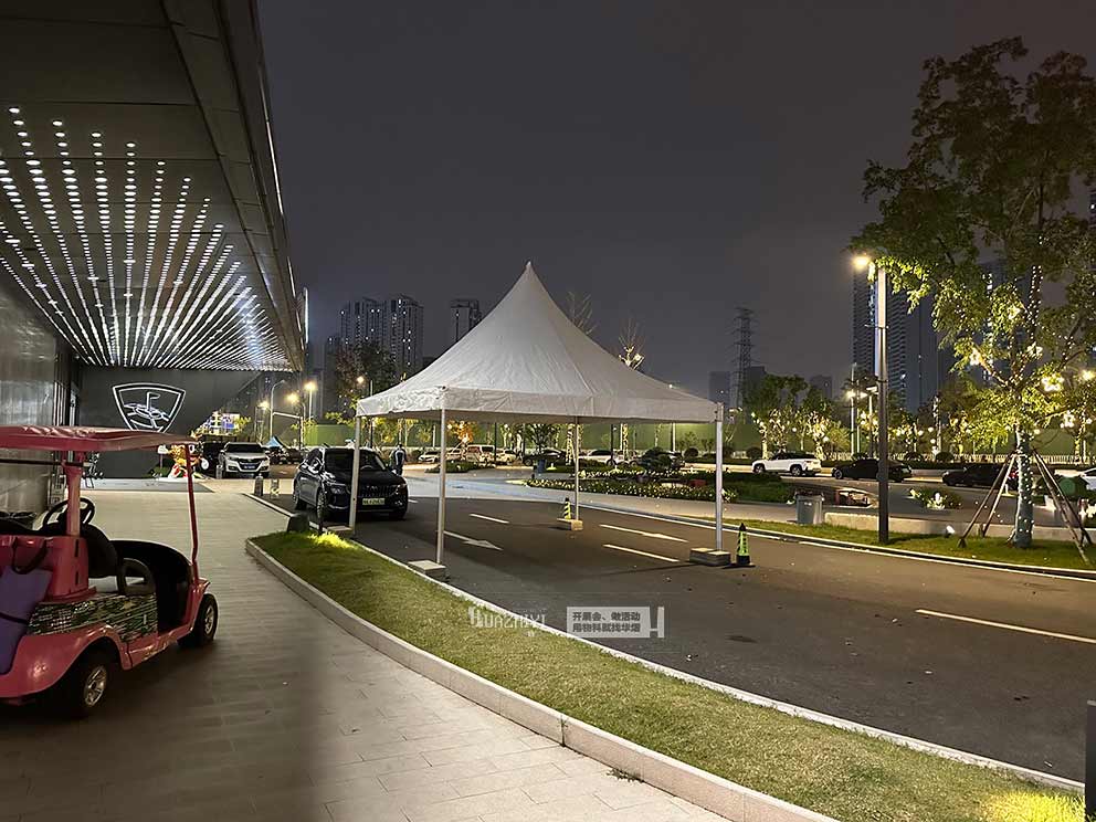 平頂山帳篷租賃布置的白色尖頂帳篷,成為活動現(xiàn)場的核心功能樞紐。帳篷采用高強(qiáng)度鋁合金支架,純白色尖頂造型簡約大氣,無四周篷布的開放式設(shè)計讓空間通透開闊,與高爾夫場地的綠意盎然形成鮮明而和諧的視覺搭配。尖頂帳篷的高挑空設(shè)計增強(qiáng)了空間層次感,頂部透光篷布引入自然光線,白天無需額外照明即可保持明亮,既方便參與者開展輕量互動,又能作為活動信息的臨時發(fā)布點(diǎn),讓功能與氛圍完美融合。